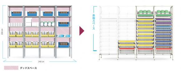 従来のオープンシェルフでは、33%から50%のデッドスペースが生じてしまいますが、ラックシステムを用いて収納することで、スペースに余裕が生まれます。