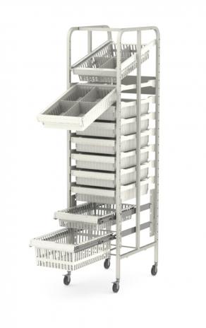 ラックシステムでは、スライド式のバスケットを引き出すことで、奥の材料も取り出しやすくなっています。バスケットを引き出した際に傾斜がつき、トレイ内全体を確認でき、奥のものを取り出しやすくなっています。