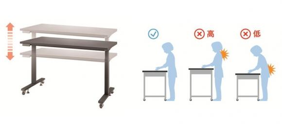 ボタン操作で高さが調整できますので、作業者の肩や腰への負担を軽減できます。