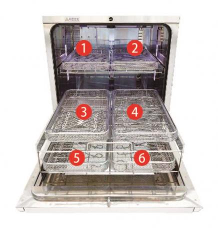 1回の運転でDINバスケット6 枚を積載し処理することができます。 ※別売品のラックを使用することで、DINバスケット8枚積載可能。