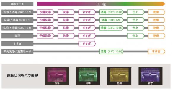 多彩な洗浄/消毒コースを搭載 「すすぎ 10分」から「93℃ 10分洗浄/消毒」まで、多彩なコースを搭載。