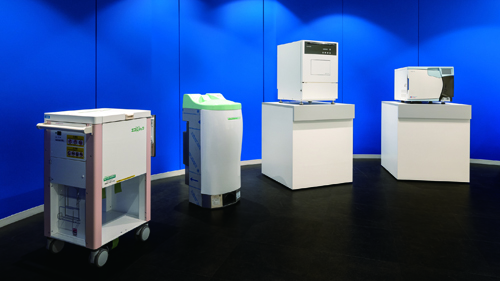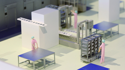 病院内で使用された医療器材の回収から洗浄・滅菌、払い出しまでオートメーション化された器材再生処理の流れをジオラマで確認いただけます。